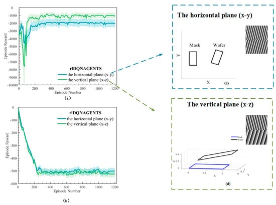 As shown in Figure 7, in order to test the stability of the algorithm and its adaptability to different models, a comparative analysis was conducted on the horizontal plane tilt environment model (x–y) and the vertical plane tilt environment model (x–z) from two perspectives: the learning curve and Episode Q0. As shown in Figure 7c, the horizontal plane tilt environment model included the mask and wafer in the horizontal plane, as well as the generated Moiré-based phase imaging. The mask was in a balanced state, while the wafer was in an in-plane tilted state. The tilt angle was 30 degrees. This paper measures angles from 0.1 to 60 degrees in the environmental input and measures them proportionally. The 30 degrees here are just a set of simulation conditions as an example to simulate the leveling accuracy of this strategy in the case of large angles. The alignment mark of the mask was a line grating with a period of 4 μm and a duty cycle of 1:1. The alignment mark period of the wafer was 4.2 μm. A line grating with a duty cycle of 1:1 is generated because the wafer was in the horizontal plane tilted state. This produced the horizontal plane inclined Moiré fringe. As shown in Figure 7d, the vertical plane tilt environment model (x–z) included the mask and wafer in the x–z direction and the generated Moiré-based phase imaging. The mask was in a balanced state, while the wafer was tilted in space. The tilt angle in the z direction was 30 degrees. The mold alignment mark period was 4 µm, and the duty ratio was 1:1 for the line grating. The period of the wafer alignment mark was 4.2 μm, and the line grating duty ratio was 1:1 due to the tilt of the wafer in space, thereby affecting the frequency and angle of the fringes, generating an inclined Moiré fringe in the vertical plane. The thickness of the upper and lower stripes was inconsistent.