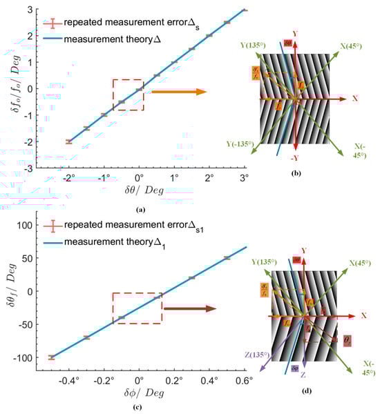 The normalized frequency and angular deviation of the Moiré fringe tilt relative to (a) the horizontal plane, (b) the vertical plane, (c) the angle calculation of the horizontal plane, and (d) the angle calculation of the vertical plane.