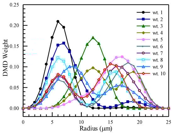 Using the refractive index profiles, the EMB of a particular fiber can be obtained from its differential mode delay (DMD) chart, which is the sequence of output pulses resulting from single-mode pulse launches at various radial offsets at the input. In reality, the DMD chart is measured using a DMD bench, while, in our case, it is calculated based on the refractive index profile [25]. In the standard, 10 VCSEL launch conditions were used [26], as the modal bandwidth depends on the launch condition. The DMD weight functions associated with the 10 launch conditions are shown in Figure 4. Using the measured DMD chart, the output pulses over ten VCSEL launch conditions are assembled as weighted by the ten DMD weight functions. The modal bandwidth associated with each weight or launch condition can be calculated from the 3 dB drop of the frequency response, S21, and is referred to as calculated effective modal bandwidth (EMBc). The frequency response of a particular launch condition is calculated from the Fourier transform of the input pulse () and output pulses as follows: