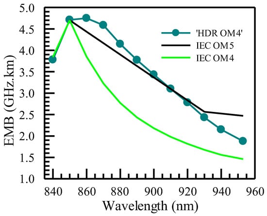In Figure 6, we show the wavelength dependence of EMB for ‘HDR OM4’ obtained from the Monte Carlo simulation with a comparison to two related types of MMFs, namely OM4 and OM5. The EMB values for OM4 and OM5 are based on IEC guidance. As mentioned in Section 1, OM5 was established for supporting SWDM-based VCSEL transceivers with the highest wavelength at 953 nm. SWDM is a type of WDM that includes more wavelengths and, therefore, more data traffic within one transceiver, which is in contrast to BiDi transceivers, which use 850 nm and 910 nm. However, in the past decade, BiDi transceivers have seen more widespread use and have now reached the Terabit age [6]. MMFs that can align with the underlying transceivers would allow for more economical deployments of such applications in larger volumes. It can be found that the EMB values of ‘HDR OM4’ are roughly equal to or above those of OM5 from 840 nm to 920 nm. Therefore, it has the same capability as OM5 for the wavelengths of interest for BiDi transceivers. Even for wavelengths from 920 to 953 nm, where the EMB of ‘HDR OM4’ falls below that of OM5, the EMB values are still significantly better than those of OM4, enabling better transmission reach when SWDM wavelengths are used. On the other hand, OM4’s EMB decreases rapidly as the wavelength increases from 850 nm, which explains the limitations encountered for transmission at longer wavelengths, such as those used in BiDi transmission.