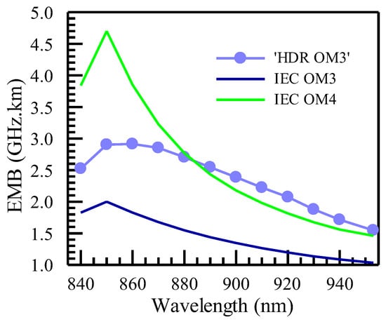 We first show the EMB of OM4 and OM3 in Figure 5a,b, referring to them as ‘IEC OM4’ and ‘IEC OM3’, respectively, as they are based on IEC guidance. The curves with discrete dots were obtained from Monte Carlo simulations for OM4 and OM3. They were labeled as ‘Monte Carlo OM4’ and ‘Monte Carlo OM3’ to differentiate them from the IEC-guided OM4 and OM3 EMBs. As the wavelength moves away from 850 nm, the EMB values for both OM4 and OM3 decrease, because the EMB value at 850 nm can be achieved by MMFs with peak wavelengths higher or lower than 850 nm. The agreement between the IEC guidance and the current Monte Carlo simulations is excellent. Note that the low-end EMB values in the simulation were obtained from the 99.9th percentile instead of using the 100th percentile or absolute lowest value, in order to be more realistically aligned with real-world situations. The agreement also gives us confidence that the methodology used in the current work would be valid when applied to ‘HDR OM4’ and ‘HDR OM3’.