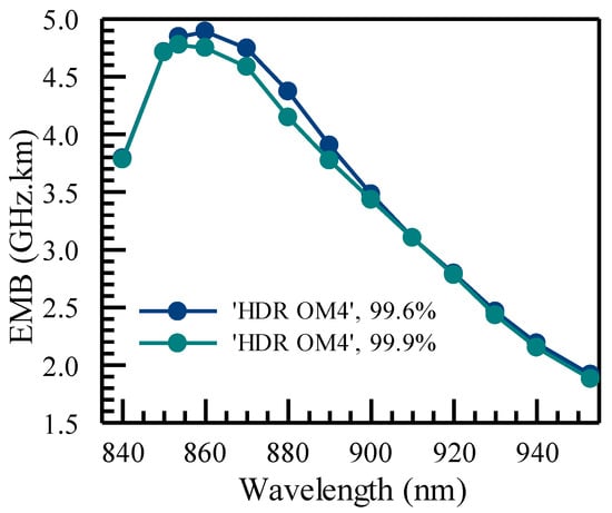 In the Monte Carlo simulation presented above in Figure 6 and Figure 7, we have used the 99.9th percentile for obtaining the low-end EMB. We would note that the low-end boundary can be affected by how EMB is distributed. To illustrate how the change in percentile can affect the EMB, we show the results obtained from two thresholds in Figure 8. Some differences are shown for wavelengths between 850 and 900 nm, but smaller differences are observed at higher wavelengths. In particular, in the 99.6th percentile, the EMB of ‘HDR OM4’ exceeds 4700 MHz·km over the range of 850 nm to 870 nm. The actual low-end EMB values can be fine-tuned to align with realistic situations with the support of actual measurement results.