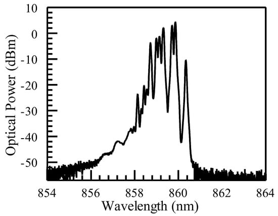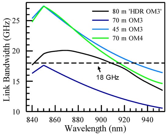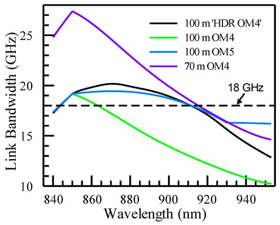 VCSEL transmission data rates have increased from 10G to 25G and now reach 100G per wavelength. To fabricate VCSELs with higher bandwidth, indium has been added to the quantum well to improve the differential gain, resulting in the operating wavelength shifting higher [32]. This situation has occurred since the adoption of 25 Gbaud VCSEL transceivers. In Figure 12, we show the optical spectrum, as measured from one 850 nm channel of a 400G SR4.2 transceiver (LMQ8811B-PC+ from Hisense, Qingdao, China). Additionally, 400G SR4.2 transceivers adopt two wavelengths around 850 nm and 910 nm, with each channel operating with 50G PAM4 modulation. The center wavelength is 859.5 nm in this case. Although the nominal wavelength for the 850 nm window is defined as 844–863 nm in IEEE 802.3db for 100G per lane, it is known in the industry that, for much of the 850 nm window, 100G VCSELs have center wavelengths around 860 nm, with the range between 850 and 870 nm. The higher range is outside the current 850 nm window defined by the IEEE standard. While accepting this de facto situation, we show that ‘HDR MMFs’ are ideally positioned for such wavelength shifts of 850 nm VCSELs to maintain desired transmission reaches. In Figure 13, we zoom in on several curves from Figure 10 between 845 and 875 nm. As seen, for OM4, the link bandwidth drops below 18 GHz at 863 nm and beyond. Therefore, for the wavelength range between 863 nm and 870 nm, the transmission reach is below 100 m, with the lowest reach at 870 nm being 96 m. On the other hand, both 100 m ‘HDR OM4’ and 100 m OM5 retain a link bandwidth above 19 GHz, exceeding the 18 GHz threshold.