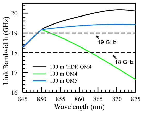 The link bandwidth as a function of wavelength for 100 m ‘HDR OM4’, 100 m OM4, and 100 m OM5.