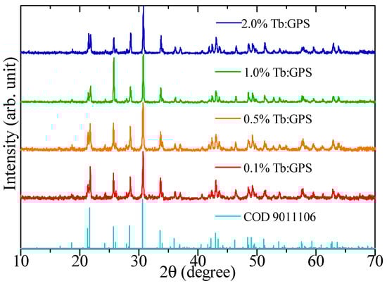 The XRD patterns of powdered Tb:GPS specimens together with a reference pattern of pure GPS (COD 9011106) are presented in Figure 2. In comparison, the specimen’s XRD patterns show similar peaks to the reference pattern of the undoped GPS, which implies a single phase of GPS crystals without adulteration, within the XRD machine’s limitations.