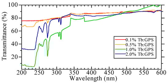 The transmittance spectra of Tb:GPS specimens are illustrated in Figure 3. The strong absorption band centered around 220 nm comes from the spin-allowed 4f-5d transition of Tb3+. Two additional absorption lines at 272 and 312 nm, clearly observed in 1.0 and 2.0% specimens, are due to the 8S7/2–6IJ and 8S7/2–6PJ transitions of Gd3+, respectively. More importantly, all specimens exhibit high transparency around or exceeding 80% in the emission spectral range of 380–600 nm (see below).