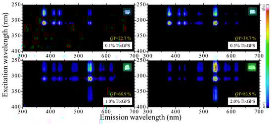 PL emission contour graph of Tb:GPS specimens in the excitation wavelength (vertical axis) and emission wavelength (horizontal axis) ranges of 250–400 and 300–700 nm, respectively.