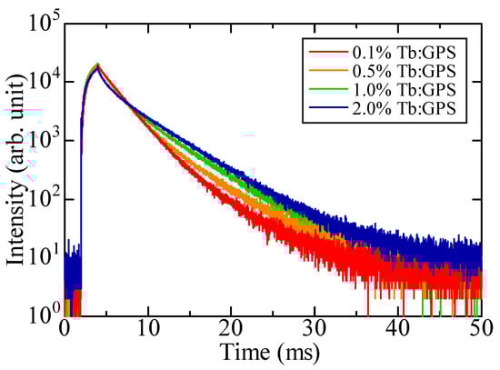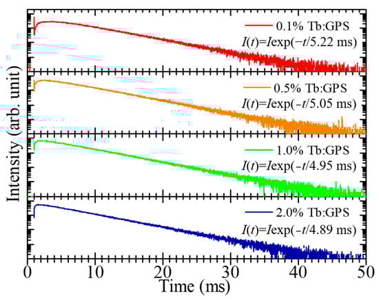 The PL lifetime profiles of Tb:GPS specimens is exhibited in Figure 5. To focus on the main 5D4 → 7F5 emission transition of Tb3+ at 544 nm, this measurement uses the excitation and observation wavelength of 265 and 550 nm, respectively, according to the previous PL emission results. It is crucial to note that all specimens exhibit rise time characteristics in the initial decay part of the profiles originating from the 5D4 level. This should be related to the above-mentioned cross-relaxation process between closely lying Tb3+ pairs (the donor Tb3+ ion transits from 5D3 to 5D4, whilst the acceptor ion transits from 7F6 to 7F0) []. The PL decay profiles, excluding the rise time in the initial parts, can be well fitted by an exponential decay function, as depicted under the names of each specimen. The PL decay constants for 0.1, 0.5, 1.0, and 2.0% Tb:GPS specimens are 5.22, 5.05, 4.95, and 4.89 ms, respectively. These results align with prior research on Tb-doped scintillator materials []. However, a decreasing trend in the decay time constant at higher Tb-doping concentrations is observed, a phenomenon that could be influenced by concentration quenching. The identical trends in decay time reduction are also noted in published articles examining concentration dependence in inorganic scintillators [,].