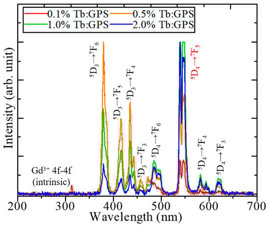 The X-ray-induced scintillation spectra of Tb:GPS specimens are displayed in Figure 6. The vertical axis (intensity) represents the qualitative value of this measurement. All specimens exhibit nearly identical spectral wavelengths. Additionally, the scintillation wavelengths are also nearly identical to the PL emission wavelengths (Figure 4), alongside intensity shifts due to 5D3–5D4 cross-relaxation. In sum, the scintillation from Tb3+ 4f-4f transitions, including 378 (5D3→7F6), 420 (5D3→7F5), 440 (5D3→7F5), 489 (5D4→7F6), 544 (5D4→7F5, strongest), 586 (5D4→7F4), and 622 nm (5D4→7F3), is found in all specimens. Besides the Tb3+ 4f-4f transitions, the scintillation from the intrinsic Gd3+ 4f-4f transition at 312 nm (8S7/2→6P7/2) is uniquely observed in the 0.1% Tb-doped specimen due to the relatively low Tb-doping concentration []. Overall, the scintillation spectrum of Tb:GPS resembles the other Tb-activated scintillators [].