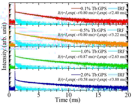 PL lifetime profiles of Tb:GPS specimens upon excitation at 265 nm and observation at 550 nm, with the decay time fitting equation.