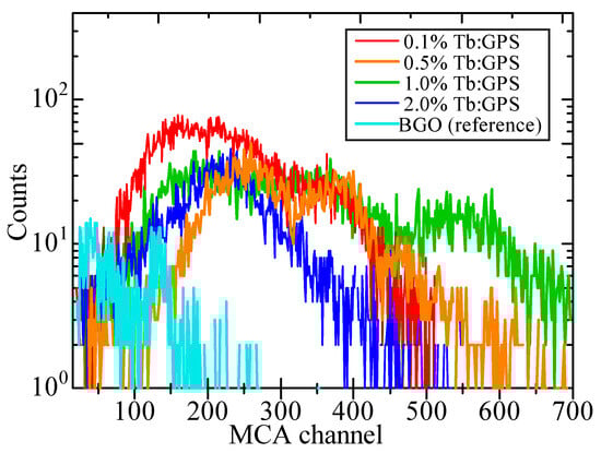 Pulse height spectra of 662 keV (137Cs) γ-rays measured with Tb:GPS specimens and a BGO reference.