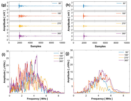Figure 5g,h present four signals acquired at four different rotation angles, with their respective FFTs shown in Figure 5i,j. The spectrum at 532 nm displays a larger distribution of frequencies with greater amplitude compared to 355 nm, considering that the signals contain the vibration frequencies of the complete system.