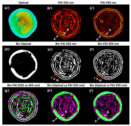 As shown in Figure 7, a final analysis was performed to compare the PAIs using image composition. The purpose of this analysis is to identify the similarities and differences by superimposing the PAIs obtained with the two wavelengths and the optical image of the physical sample. To highlight the salient features of the images, they were binarized. Figure 7 shows (a’) the optical image of the sample cut on the same scanning plane, (b’) the PAI obtained at 532 nm, (c’) the PAI obtained at 355 nm, (d’) the binarized image of the optical image, (e’) the binarized PAI at 532 nm, (f’) the binarized PAI at 355 nm, (g’) the binarized image composed of PAIs obtained at 532 and 355 nm, (h’) the binarized image composed of the optical image and PAI at 532 nm, and (i’) the binarized image composed of the optical image and PAI at 355 nm.