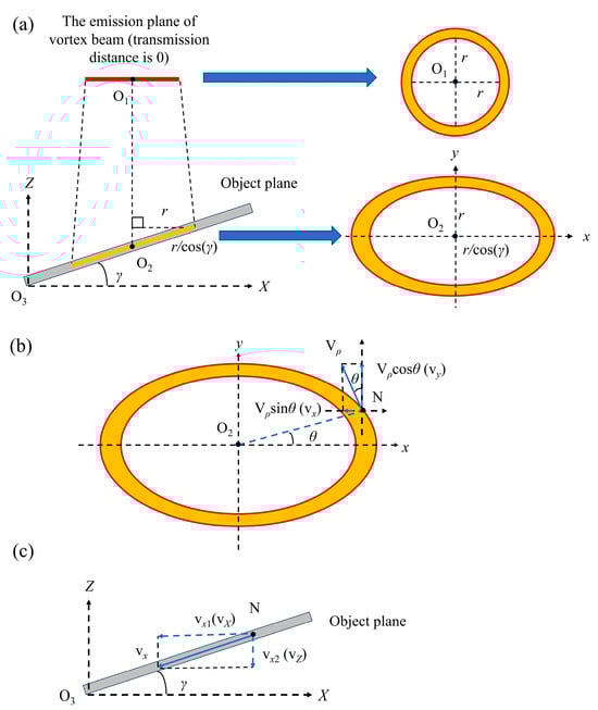 The complex amplitude of a Laguerre–Gaussian vortex beam in the emission plane (transmission distance is 0) can be represented as , wherein E0, (r, θ), ω0, and l denote the electric field amplitude, polar coordinates, waist radius, and topological charge, respectively []. Due to the phase factor exp () containing OAM carried by the vortex beam, it has a unique spiral phase wavefront structure, and the beam exhibits a hollow, circular intensity structure. In actual RDE detection, a Gaussian mode laser can be efficiently modulated into a single-mode or superimposed vortex beam through a spatial light modulator (SLM). As shown in Figure 1a, when a single-mode vortex beam is emitted, the shape of the light spot is a circular ring, and the distance from the center O1 to each point of the circular ring is equal. In practical RDE detection, a rotating object is usually a rotor driven by an electrical motor, and it can be simplified in theoretical research. When the object surface is non-tilted, the beam incidence is vertical on the surface of a rotating object, and the distance from the center O1 to each point is the radius r of the circular ring. When the object surface is tilted, assuming that the x-axis of the tilted object plane is inclined at an angle γ with the X-axis direction in the global coordinate system, the beam is no longer perpendicular to the surface, the projection of the beam on the object surface changes, and the circular ring is stretched along the x-axis direction on the tilted object surface. Therefore, the interface between the light spot and the object plane becomes approximately an elliptical ring. Each point on the elliptical ring has a slightly different distance from the light spot center O2. In short, the elliptic ring appearance is a natural result of projection transformations in geometric optics. The distances from the light spot center O2 to the symmetrical position of the elliptical ring on the object surface can be approximated as equal. The minor axis of the elliptical ring is r. The major axis of the elliptical ring stretched due to inclination is related to the tilt angle γ and can be expressed as r/cos γ. As shown in Figure 1b, the linear velocity of the tangent point N is represented as vρ = Ωρ; Ω is the rotational velocity of object and ρ is the distance from center O2 to point N. Thus, the linear velocity of the tangent point N can be decomposed in the object plane coordinate system as follows: