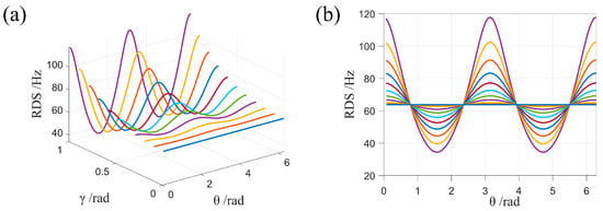 (a) Three-dimensional graph of the RDS at varying tilt angles γ and polar angles θ. (b) The graph of the RDS at varying polar angles θ. θ is in the range of [0, 2π].
