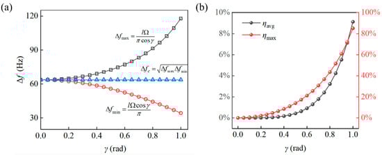 Compared with the extreme value, the center frequency shift, therefore, has a more stable and lower error RDS, which is worthy of further quantitative analysis. With the increasing tilt angle, the average deviation ηavg and maximum deviation ηmax between the frequency shift values at different tilt angles and the center frequency shift gradually increase, as shown in Figure 3b. The deviation growth rate increases with the increase in the tilt angle. When the tilt angle reaches 1 rad, the frequency shift values fluctuating around the center frequency shift (fc = 63.66 Hz) reach a maximum of 54.16 Hz, representing 85.08% of fc. The average deviation rate over the entire polar angles range is 9.12%.