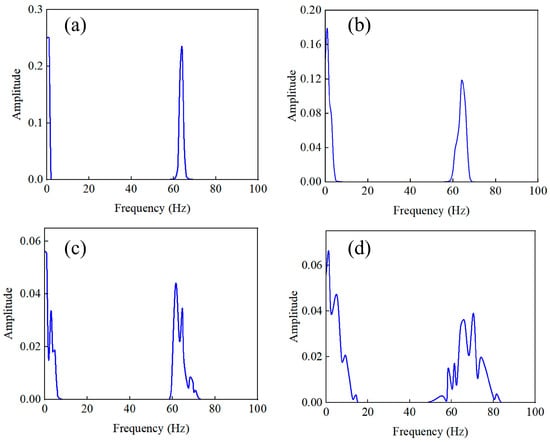 A simulated spectra example for different tilt angles is shown in Figure 4; tilt angles γ are set as 0, 0.17, 0.34, and 0.50 rad. With increasing tilt angles, the amplitude of the RDS peak gradually decreases. Several frequency peaks caused by the tilt begin to emerge around the RDS peak, and their number increases with larger tilt angles. The energy of the original RDS peak is dispersed into other frequency peaks, and the position of the peak with the maximum amplitude varies. Simply extracting the frequency peak with the maximum amplitude may result in errors compared to the actual values. Moreover, larger tilt angles result in greater deviation. Conversely, the center frequency shift value remains stable and exhibits smaller errors. More detailed simulation results are listed in Table 1. The center frequency shift values () are compared with those obtained directly by reading the frequency shift value corresponding to the maximum amplitude from the spectrum (). The real RDS of the non-tilted object is 63.69 Hz. The relative errors at γ = 0.34 rad and 0.5 rad are reduced from 4.22% and 9.91% to 1.11% and 4.78%, respectively. Consequently, the relative velocity measurement deviations are reduced by 3.11% and 5.13%, respectively.