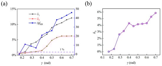 Then, the growth trends of the two RDS discrimination methods with increasing tilt angles were compared in detail. As shown in Figure 5a, the relative error δ1 between the maximum amplitude peak and the true value basically shows a linear growth trend with increasing tilt angles, and the modified goodness of fit (modified R2) is 0.985 after fitting, indicating a good degree of fitting. δ2 increases slowly for γ < 0.4 rad, increases evenly until γ = 0.6 rad, and then gradually steadies at about 6.2%, indicating that the center frequency has higher stability and a lower velocity measurement deviation rate at a large tilt angle. Additionally, the frequency difference between the maximum and minimum frequency peaks, or the spectral broadening ΔfSD, increases with the increasing tilt angle in the overall trend. When the relative velocity error is less than 1%, the velocity measurement system can be considered to have a low velocity measurement deviation. The maximum tilt angle with a relative error of 1% increases from 0.221 to 0.287 rad, representing an improvement of 29.9%. Subsequently, the relative RDS error reduction rate δΔ = δ1 − δ2 is analyzed, as shown in Figure 5b. The reduction rate maintains an increasing trend in the range for γ < 0.4 rad and 0.6–0.7 rad. When γ = 0.7 rad, the velocity measurement deviation reduction rate δΔ reaches 5.85%. These detailed quantitative analyses show that the method of calculating the rotational velocity using the center frequency effectively reduces the RDS and velocity measurement deviation of the tilted object.