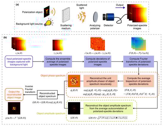 where represents the phase of . The above equation has the same form as Equation (7). Therefore, when interference from background light exists, the bispectrum of the deviation of the speckle image can be utilized to eliminate the interference and recursively reconstruct the object phase spectrum. The flow of this recursive reconstruction is the same as that of the p-ReDBI. It is noteworthy that in the derivation of Equation (26), we only considered the existence of background light, but whether it is polarized or not has not garnered attention. In other words, the principle of object phase spectrum reconstruction depicted in Equation (26) is still applicable even when the background light is not linearly polarized.