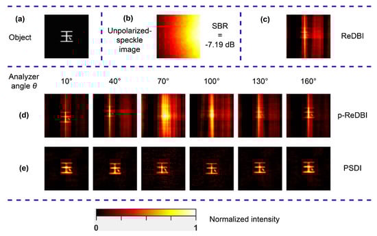 It is worth noting that when there is a significant difference in the polarization direction between the object light and the background light, the ratios of energy between the object light and the background light in the polarized speckle images collected at different analyzer angles also vary. Therefore, by utilizing the polarization diversity of the scattering scene, the analyzer angle can be adjusted to increase the proportion of the object light energy in the speckle images, and subsequent reconstruction can be executed by p-ReDBI after mitigating the interference from the background light. This method is particularly suitable when the background light is nearly linearly polarized. In this situation, the background light in the polarized speckle image at a certain analyzer angle will be almost eliminated.