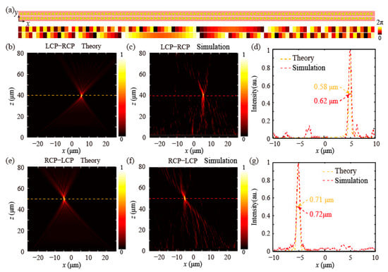 - Cai, J.; Yu, H. Full-space wavefront manipulation enabled by asymmetric photonic spin-orbit interactions. Opt. Express 2023, 31, 1409–1419. [Google Scholar] [CrossRef]