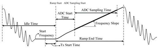 Using the combination of this radar and DCA1000, this device can realize real-time data acquisition and efficient transmission of dual-channel and four-channel low-voltage differential signals of radar sensors. The collected data are quickly transmitted to the computer via Ethernet, which greatly simplifies the subsequent analysis of the data and is suitable for diversified development scenarios such as image processing. The chirp slope is the slope of frequency computed from the sweep bandwidth of B and the chirp duration of T (K = B/T). The FMCW signal configuration parameters are shown in Figure 5.