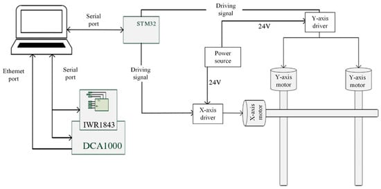 The motion trajectory of the moving module is designed as follows: first, it is stably fixed at a certain height, and then it moves gradually on the azimuth dimension to achieve the effect of synthetic aperture. After completing this step, it transitions to the next height dimension at the same raised height, and repeats the above operations until the cumulative distance traveled by the height dimension reaches the pre-set standard. The working block diagram of the imaging system platform and the imaging process are shown in Figure 6.