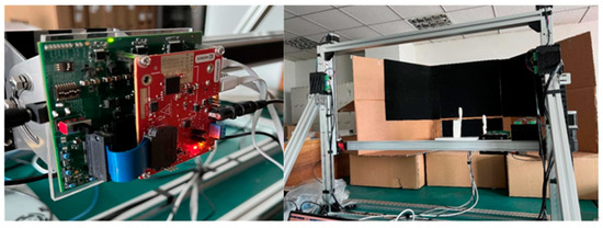 In order to verify the effectiveness of the proposed algorithm in practical applications, the IWR1843 FM CW radar chip with an operating frequency of 77 GHz is used for experiments in this section. In the experiment, this paper uses the movement of the slide platform to simulate the synthetic aperture, and the radar is embedded in the slider as the hardware basis to realize the synthetic aperture. The IWR1843 radar chip is connected to the DCA1000 data processing board in the mobile module, and the captured data are uploaded to the computer instantaneously, with the help of Ethernet technology. In addition, the computer side also has the control function of the radar movement mode and can conduct in-depth processing of the subsequent collected data.