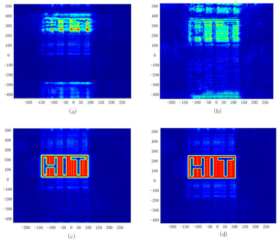 Through the analysis of Figure 10a, the single-channel algorithm fails to meet the requirements of the spatial Nyquist sampling law in the imaging process because the sampling is too sparse, so that the frequency spectrum aliasing occurs in the height dimension. This phenomenon directly leads to the reduction in the clarity of the target image, and the geometric shape features become blurred, making it difficult to clearly identify the geometric features of the three letters HIT. Specifically, the HIT letters are compressed and part of the information is lost. However, when the virtual array imaging algorithm under MIMO is adopted, it can clearly be seen that the geometric characteristics of the target have been significantly improved compared with the single-channel algorithm, which is more visible, but the boundary is still unclear, and some artifacts caused by aliasing are partially removed but still exist. At this time, the complex gain vector w is introduced for multi-channel coherent combination. The imaging results are shown in Figure 10d. The results of the compressed sensing imaging algorithm (TSA) are shown in Figure 10c. When one-half, two-dimensional random sampling is introduced, the hollow part of the letter has a very good sparse expression. Compared with the coherent superposition sampling algorithm proposed in this paper, the edge of the hollow part is somewhat fuzzy.