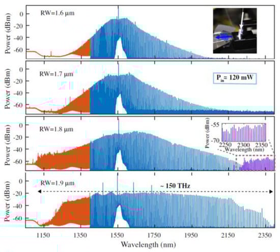 - Luke, K.; Okawachi, Y.; Lamont, M.R.E.; Gaeta, A.L.; Lipson, M. Broadband Mid-Infrared Frequency Comb Generation in a Si3N4 Microresonator. Opt. Lett. 2015, 40, 4823–4826. [Google Scholar] [CrossRef]