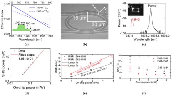- Lu, X.; Moille, G.; Rao, A.; Westly, D.A.; Srinivasan, K. Efficient Photoinduced Second-Harmonic Generation in Silicon Nitride Photonics. Nat. Photonics 2021, 15, 131–136. [Google Scholar] [CrossRef] [PubMed]