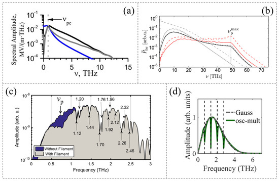Reports on the spectral enhanced peak date back to 1993 [13], where the observed THz peak frequency shifted with the plasma density. Later, the enhanced peaks in THz spectra were observed in both single- and two-color laser pumping schemes, e.g., by V. A. Andreeva et al. [6] (Figure 1a), Na Li et al. [12], Xiaomin Qu et al. [19] and Jiayu Zhao et al. [11]. Moreover, THz spectral broadening has also been detected in the study of THz–plasma interactions by I. Thiele et al. [14] (Figure 1b). This spectral broadening might be regarded as another form of spectral enhanced peak away from the original peak.