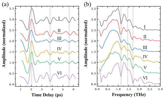 THz signals extracted from the literature [18,20,21,22,23,24] for the (a) time and (b) frequency domain, respectively. Vertical lines mark the same peaks or valleys of all the signals. Four signals of (I–IV) are from laser-filament-based THz sources, while the other two (V, VI) are from nonlinear-crystal-based THz sources.