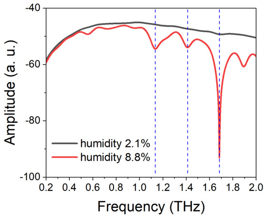 For example, we performed experiments under two humidity values of ambient air, with the laser parameters being the same as listed in Table 1, and the THz results are shown in Figure 3. Similar multiple spectral dips can also be seen along the blue dashed lines in the case of large humidity, which seems unrelated to the THz–plasma interactions.