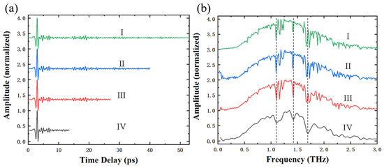 These observations further led to similarities between the corresponding four spectra, as depicted as (I–IV) in Figure 2b, which were Fourier-transformed from those in Figure 2a. Three vertical dashed lines are included to emphasize the three spectral dips, which are consistently located at about 1.125 THz, 1.4 THz, and 1.7 THz, respectively.