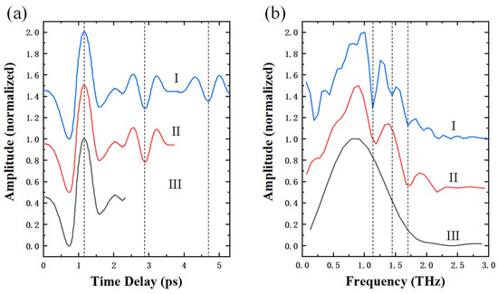 Therefore, we extracted the water absorption signal from Ref. [21] and performed Fourier transforms on it. The resultant time- and frequency-domain waveforms are shown as (I) in Figure 4a and Figure 4b, respectively. We found that the locations of spectral dips are mainly around 1.12 THz, 1.35 THz and 1.65 THz, which are similar to those in Figure 2b. This strongly suggested a relationship between the spectral dips (Figure 2b) and the water absorption of THz waves. However, the typical water absorption spectrum in Figure 4b exhibits narrow and fine dip structures, while the dips in Figure 2b have much broader widths. Therefore, we subsequently focused on altering the dip width to gain a more comprehensive understanding of the origin of these dips.