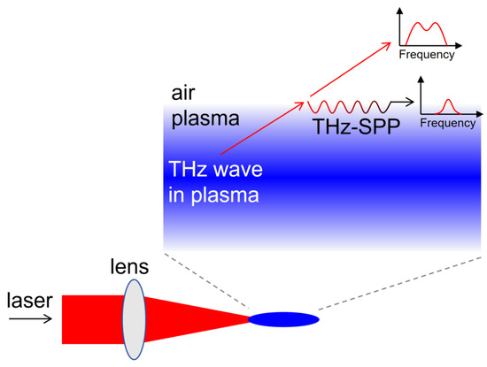 However, considering the spatial scale comparison between laser filaments (tens of micrometers in diameter) and THz waves (hundreds of micrometers in wavelength), it can be expected that the existence of a surface plasmon wave (SPW) in the THz band on the periphery of the laser filament is supported [16,18]. Specifically, as shown in Figure 6, femtosecond laser pulses are focused in the air to create the plasma filament column. Then, the THz wave can be generated within the plasma region, and during its off-axis radiation, it could excite SPW at the plasma–air interface. Figure 6 proposes an internal excitation mechanism of interactions between THz waves and the plasma, which is different from the scheme that the pumping light is usually incident from the external ambient air to the material surface. It is worth noting that Figure 6 does not depict the generation process of THz waves, but rather the interaction of THz waves with the plasma after its generation. During this interaction, the surface-bound THz waves may be created, leading to a spectral defect (i.e., a dip) in the emitted THz spectrum in the air. This represents an attempt to analyze the interaction between THz waves and the plasma filament from the perspective of the surface plasmon.