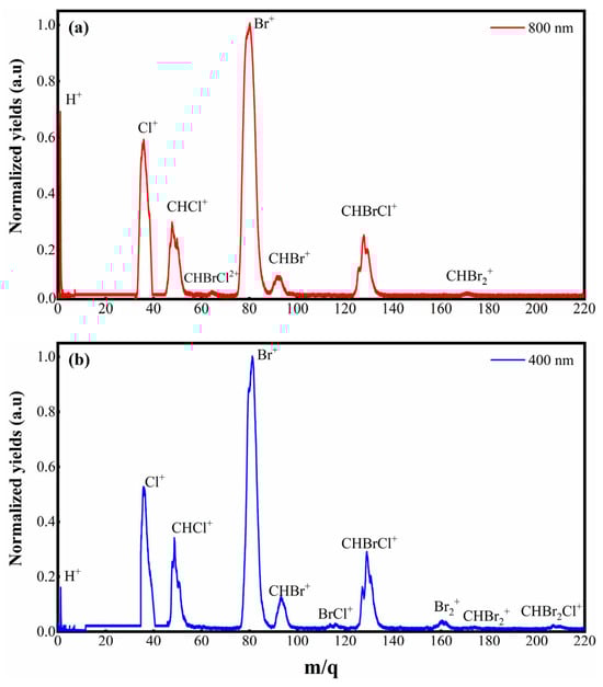 The time-of-flight mass spectrum of the molecule CHBr2Cl irradiated by (a) 1.0 × 1014 W/cm2, 800 nm, and (b) 4 × 1013 W/cm2, 400 nm laser fields, respectively.