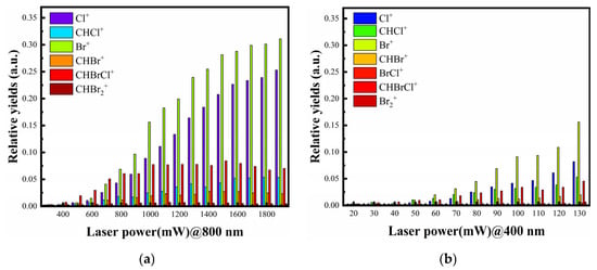 The yield of product fragment ions varies with laser power at (a) 800 nm, and (b) 400 nm laser fields, respectively.