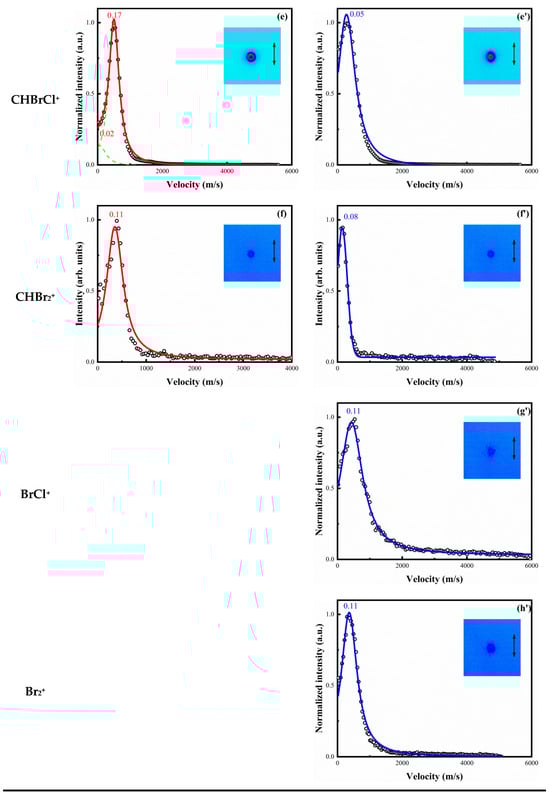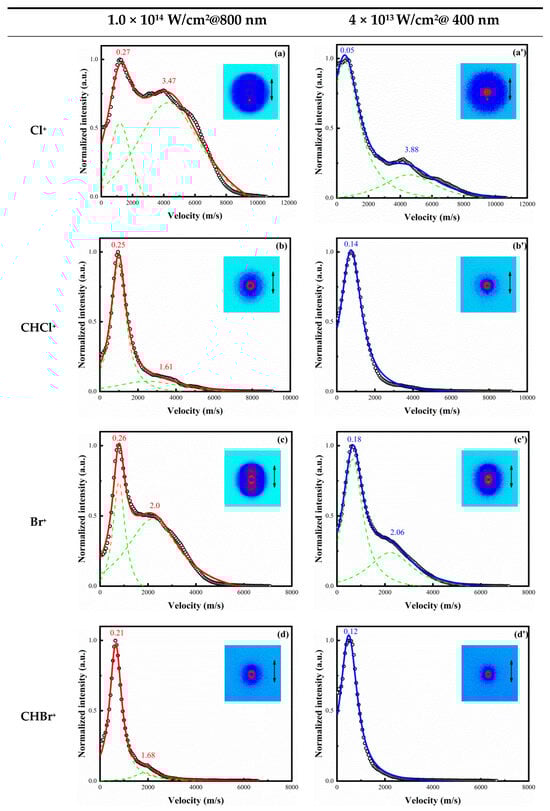 In addition to analyzing time-of-flight mass spectra, the investigation extends to the examination of kinetic energy release (KER) of fragment ions under varying laser conditions. Figure 3 displays the normalized velocity distribution of fragment ions along with the DC-sliced images. The red curve corresponds to data obtained using an 800 nm laser field, while the blue curve represents data acquired with a 400 nm laser field. The velocity distribution exhibits a multi-peaked structure for some of the fragments, indicating the existence of multiple reaction pathways. Typically, the low kinetic energy component of the fragments results from the dissociation of single-charged parent ions, whereas the high kinetic energy component is attributed to the Coulomb explosion process of multi-charged parent ions. Notably, it has been observed to reduce the yields of the heavy fragments CHCI+, CHBr+, CHBrCl+, and CHBr2+ with high KER in the 400 nm laser filed. This reduction is linked to the limited laser intensity of up to 4 × 1013 W/cm2 in 400 nm laser fields, rendering the Coulomb explosion effect negligible. The high kinetic energy component observed in the Br ion data in Figure 3(c′) is proposed to stem from a sequential dissociation process rather than a Coulomb explosion, as no corresponding ion with a high kinetic energy component has been identified. Additionally, fragments of BrCl+ and Br2+ ions have only been detected in Figure 3(g′,h′) when irradiated by 400 nm laser fields.
