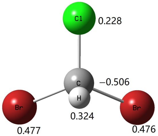 Natural bond orbital (NBO) charge distribution of CHBr2Cl+ ions.