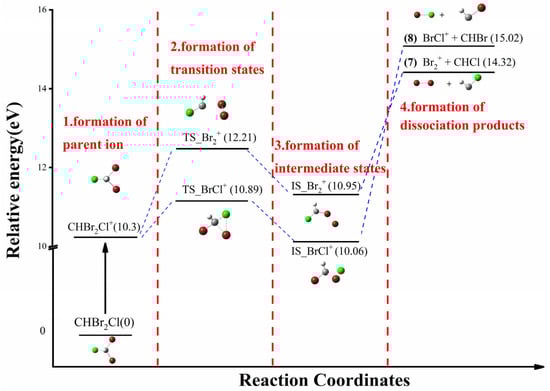 The generation of BrCl+ and Br2+ ions in 400 nm laser field, as depicted in Figure 1, indicates the presence of varied dissociation pathways. To delve deeper into these pathways, Gaussian 16 was employed for computational analysis. Figure 5 illustrates the elimination process, which can be divided into three sequential stages: firstly, the neutral parent molecule loses an electron to form the parent ion; secondly, the parent ion transitions via a conformation change to an immediate compound; and finally, the intermediate compound facilitates bond cleavage, resulting in the formation of distinct fragments.