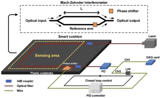 In this study, ballistocardiogram (BCG) monitoring is performed non-invasively using a smart cushion. The monitoring system consists of a proportional–integral–derivative (PID) controller, a phase shifter, as well as a Mach–Zehnder interferometer (MZI) BCG monitor. The system for monitoring consists of a low-speed photodetector (PD), a DFB laser, a phase shifter, as well as the MZI-based BCG monitor. Comprising two 3 dB couplers that operate as optical splitters as well as couplers, correspondingly, the MZI is positioned atop a plastic substrate to enable smart cushion packing. The MZI along with the phase shifter have been parallelly fixed as well as located beyond the sensing area. The BCG signal is transformed by the PD into an electrical signal that splits between the CH1 and CH2 channels. The low-pass filter (LPF) processed data as an input for the PID controller is included in CH2, whereas CH1 represents the raw data. To keep the system running at a quadrature point, the controller adjusts for phase drift. A data acquisition (DAQ) card (National Instrument, USB6001) records the unprocessed information from CH1.