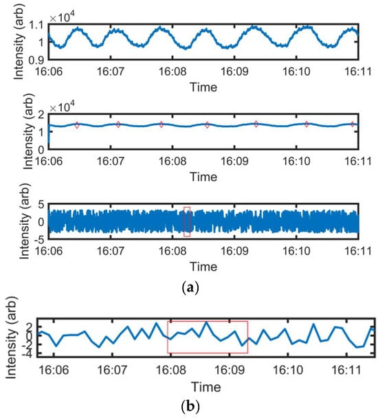 (a) The extracted heartbeat signal, respiration signal, and acquired BCG signal by the optical fiber sensor. (b) Detailed information of the original BCG signal framed by a red box of (a).