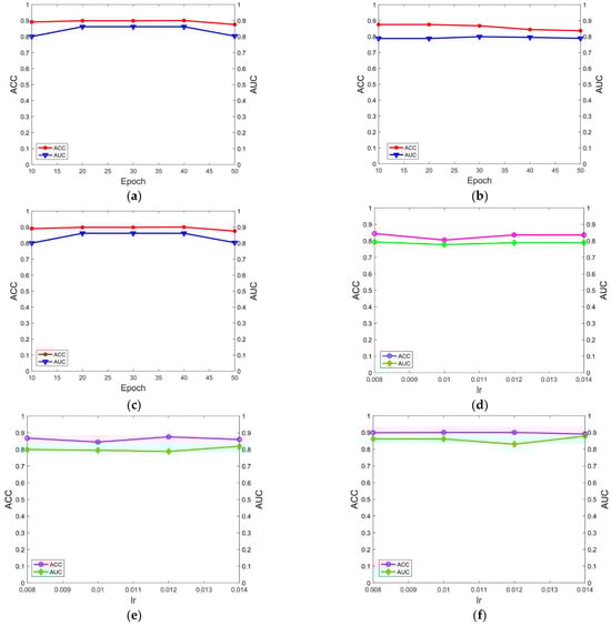 The model performance between different epochs and learning rates. (a–c) ACC and AUC performance with different epochs and (d–f) ACC and AUC performances with different learning rates.