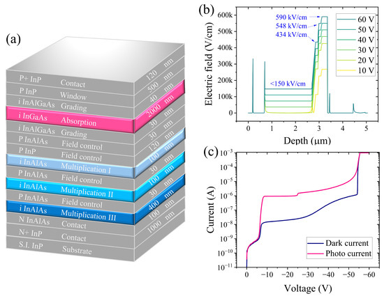 (a) Epitaxial layer structure of our self-developed InGaAs/InAlAs SPAD. (b) Calculated electric-field distribution along the growth direction. The electric field strengths are as follows for the different layers: 150 kV/cm for the absorption layer, 434 kV/cm for the first multiplication layer, 548 kV/cm for the second multiplication layer, and 590 kV/cm for the third multiplication layer. (c) Dark current and photocurrent of our self-developed InGaAs/InAlAs.