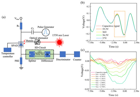(a) Illustration of self-differencing circuit. (b) Output signal without self-differencing circuit. (c) Avalanche signal obtained after the elimination of the capacitive signal through a self-differencing circuit. The orange dotted region marks the location of the avalanche signal.