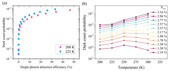 The SPADs are operated in gated mode, where the applied voltage bias consists of both a direct current (dc) component and a periodic voltage pulse. The voltage pulse has a frequency of 104.7 MHz and a pulse width of 1.5 ns. The avalanche signal is superimposed onto the capacitive signal coupled through a diode junction. A 1550 nm pulsed laser with a 30 ps pulse duration and a repetition rate of 26.2 MHz, which is one-fourth of the gate frequency, is employed as the photon source. We obtain a faint laser by passing the source through a strong attenuator. To ensure the security of real applications and enable single-photon characterization, the mean photon number in each laser pulse is kept very low. Therefore, the laser beam is attenuated to the average photon number of 0.1 and 1 per laser pulse, respectively, for the purpose of the device characterization and assessment of the PNR capability. In order to resolve the incident photon number, it is crucial to detect the initial current right after the avalanche buildup. To mitigate the capacitive response during the gated-mode operation, we implement a self-differencing (SD) circuit, as depicted in Figure 2a. This SD circuit achieves a suppression ratio of 37.6 dB, effectively eliminating the common capacitive signal and distinguishing the avalanche signal, as shown in Figure 2b,c, respectively. As a result, the minor avalanche signal can be distinguished with a 0.1 mV variation. The measurements are conducted within an LN2 open-cycle cryostat (Optistat CF, Oxford Instruments, Abingdon, UK), capable of cooling the device to 77 K. The electrical signals can be both applied and extracted through the electrical feedthrough of the cryostat. The cooling process effectively suppresses the presence of dark carriers caused by thermal generation. At a temperature of 200 K, the SPAD with a three-staircase electric-field distribution has been tested and shown to exhibit an SPDE of 46% at a dark count probability (DCP) of . The SPDE and DCP dependences on the temperature are shown in Figure 3a. The DCP is recorded over a wide temperature range for various excess biases in Figure 3b. At low excess-bias levels, the effectiveness of cooling in reducing the DCP is limited. This suggests that tunneling generation plays a dominant role in the DCP. It is also worth noting that at a high excess bias, the DCP decreases as the temperature decreases but halts within the temperature range of 200 K to 250 K, indicating the presence of an afterpulsing effect. By balancing the trade-off between afterpulsing effects and thermal generation, we chose to demonstrate the PNR measurement at 200 K. To measure the afterpulsing effect, the output signal is then routed to a time-correlated single-photon counting module (TCSPC) with a timing resolution of 4 ps. The recorded counts are subsequently organized into histograms to determine the afterpulsing probability. The afterpulsing probability increases as the temperature decreases due to the prolonged trap lifetime at lower temperatures. At a temperature of 200 K and an SPDE of 46%, where the PNR is performed, an afterpulsing probability of 21% is observed.