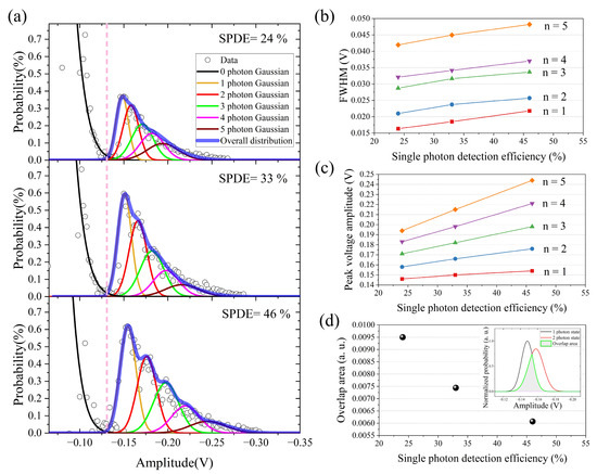 (a) Distribution of the peak output signal at different SPDE values of 24%, 33% and 46% at a temperature of 200 K. Each colored line shows the Gaussian fit for different photon-number states. (b) Peak voltage amplitude as a function of SPDE for different photon-number states. (c) Full width at half maximum as a function of SPDE for different photon-number states. (d) Overlap area between the normalized probability distribution of the one-photon and two-photon states. Inset in (d): gray region indicates the overlap area.