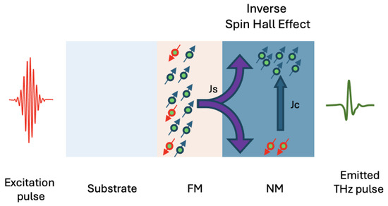 After the generation of the spin-polarized current, it will diffuse from the FM layer into the adjoining NM layer. In the NM layer, strong spin–orbit coupling (SOC) allows for the conversion of this spin current into a charge current through the inverse spin Hall effect (ISHE). Here, the spin-polarized electrons experience a force due to the SOC, leading them to scatter in directions dependent on their spin orientation, which will be eventually observed as a transverse charge current. This charge current will then be generated in a picosecond timescale to produce a THz wave. This THz wave will then propagate through the whole multilayer system and be detected [8,12,13,23,24]. A schematic layout of a typical bilayer spintronic THz emitter can be seen in Figure 2.